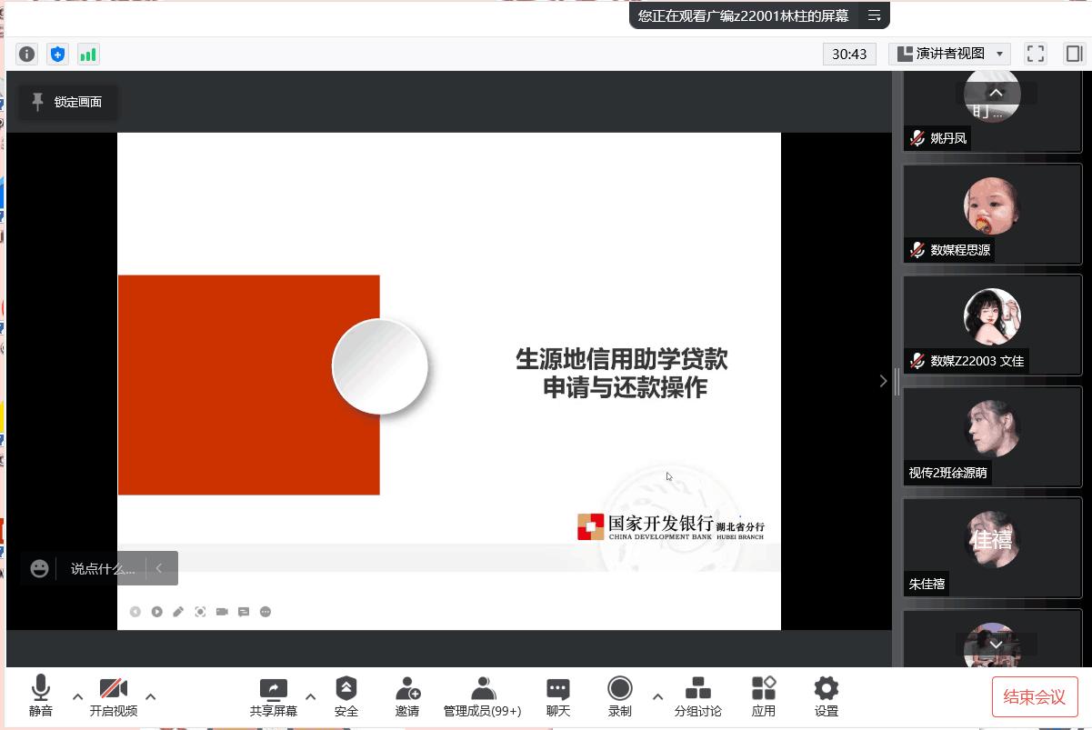 毕业年级线上开展诚信还款、诚信就业专题教育主题班会,着重开展了生源地信用助学贷款申请与还款操作的教育,提供了到资助中心使用POS机还款、到支付宝指定账号充值还款、通过助学贷款还款功能还款、使用国家开发银行生活号在线还款等多种方式,让参会的每一位同学对生源地贷款还款的流程、方式以及注意事项有了更加全面、更加深刻的认识和了解。