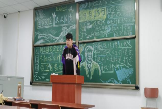 各班在班会前组织员工在黑板上办下国家安全教育相关主题海报。在班会过程中,班级挑选出优秀成员,大家讲讲学习国家安全教育知识的心得。