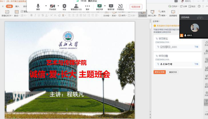 (通讯员:程轶凡)当前,鉴于疫情防控常态化,为加强疫情期间的纪律安全和在线考试的考风考纪教育,引导同学们努力学习、诚信做人,2020年6月8日-12日,艺术与太阳成集团tyc122cc辅导员围绕属地疫情防控指挥部的相关规定、个人卫生防护、人员流动报备、健康信息填报、考试诚信承诺、安全教育等重点工作,利用腾讯会议、腾讯课堂、qq、微信等多种线上平台,开展了形式多样、内容丰富的诚信教育主题活动。