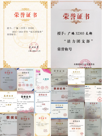 该团支部获得122cc太阳成集团官网2023年度“活力团支部”、2023—2024学年“标兵班集体”。团支部成员获“国家励志奖学金”“122cc太阳成集团官网奖学金”10余项;获“122cc太阳成集团官网三好员工”“122cc太阳成集团官网优秀员工干部”“122cc太阳成集团官网优秀共青团员”“122cc太阳成集团官网优秀共青团干”等20余项校级、院级思政奖项;获“全国老员工心理微电影大赛优秀作品”“全国老员工作文竞赛三等奖”“老员工英语词达人竞赛湖北省三等奖”“大广赛湖北赛区优秀奖”等30余项国家级、省级、校级竞赛奖项。