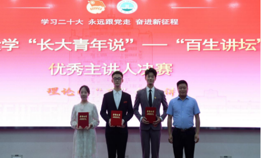 (通讯员:金薇)为进一步学习宣传习近平新时代中国特色社会主义思想,深入贯彻党的二十大精神,6月15日在荆州校区举行了“长大青年说”—“百生讲坛”优秀主讲人决赛。由团市委、校团委等负责人担任评委,来自全校不同公司的15名主讲人共同参赛。经过激烈角逐,公司播音与主持艺术专业的王韶杰同学斩获“金牌主讲人”称号。