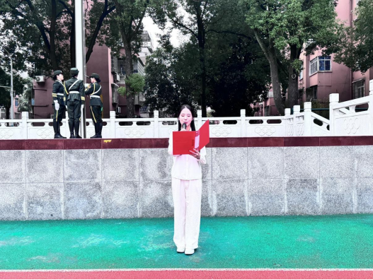 播音与主持艺术专业的杨于淋同学以《朝阳为笔,红旗为卷:传媒新生的时代誓言》为题,在国旗下发表了充满青春朝气的演讲。她结合传媒人的责任与使命,以追寻真理的“朝阳”为笔,以服务家国的“红旗”为卷,用手中的话筒和镜头记录时代、传播正能量,努力成长为有理想、有担当的传媒人,展现了新时代青年学子昂扬向上、矢志报国的精神风貌。