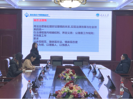 赵湘从高校危机干预的困境和策略应对两个方面进行了阐述。她要求在高校危机干预中一定要兼顾家生校,融合法理情。平衡各方利益和诉求,求得最大公约数,分析处理问题,实现双赢或者多赢。作为辅导员,我们要做到学我们不会的,做我们擅长的,防我们关切的,用我们可用的,争取以法为据,以理服人,以情感人。