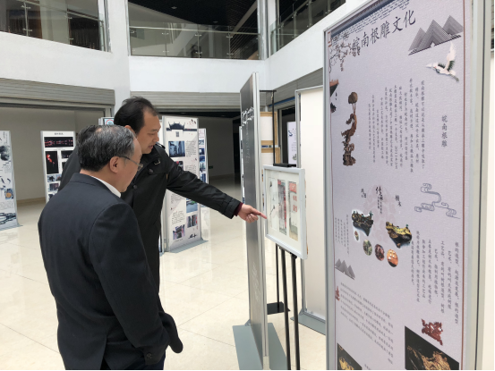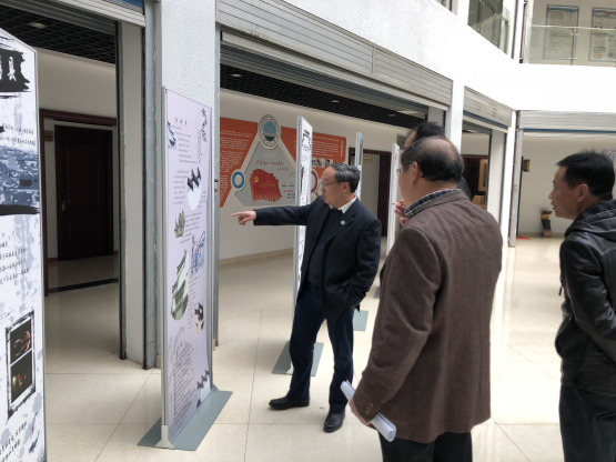 “徽派—石雕牌坊”展板前,谢董事长称道有底蕴、有个性;