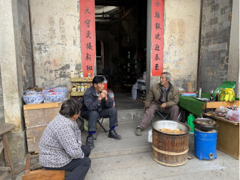 当地村民在自家门前摆着小摊,叫卖着当地特产