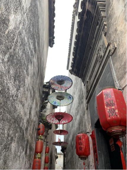 屋檐上悬挂着油纸伞,挨家挨户挂着红灯笼