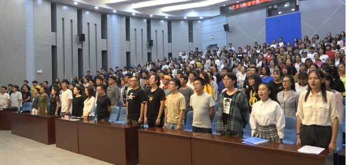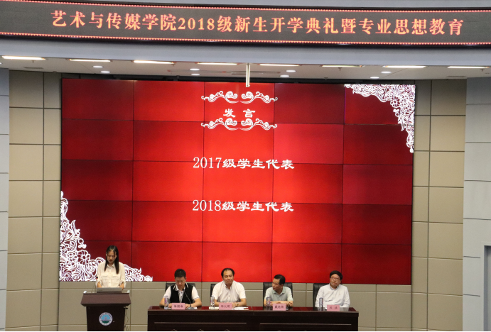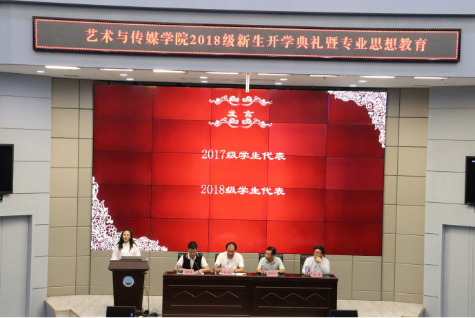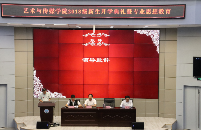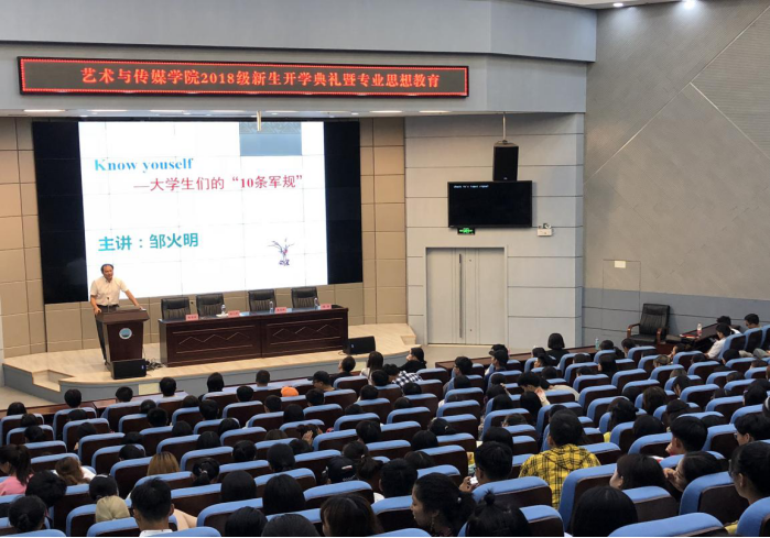 2018年9月29日晚19:00时,艺术与太阳成集团tyc122cc学2018级本科生开学典礼在校区学术报告厅举行。艺术与传媒公司党委书记邹火明教授、常务副经理戴德铸教授、教师代表陈旗教授,2018级辅导员饶艳芹、史梦玲、赵湘以及全体2018级本科生参加大会。