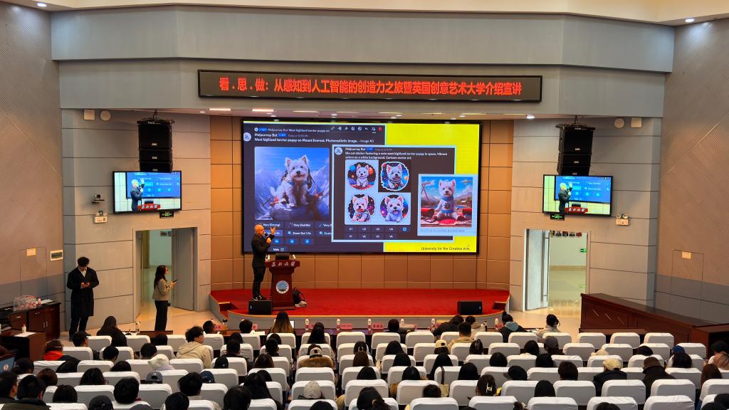 讲座中,Hedley Roberts教授围绕“感知—思考—实践”的创造力培养逻辑,结合人工智能技术在创意领域的应用实践,展开了深入浅出的阐释。他从人类感知世界的基本规律出发,通过经典艺术案例与前沿科技成果的对比分析,揭示了创造力生成的本质逻辑,并重点分享了人工智能如何成为创意实践的“得力助手”。同时,该校中国办事处卢峰老师则详细介绍了英国创意艺术大学的办学特色、学科优势国际化人才培养体系以及“3+1”项目情况,其优质的教学资源、多元的学术氛围和紧密的产业对接模式,让在场学子对该校有了比较全面、直观的认识