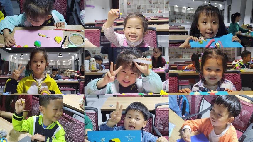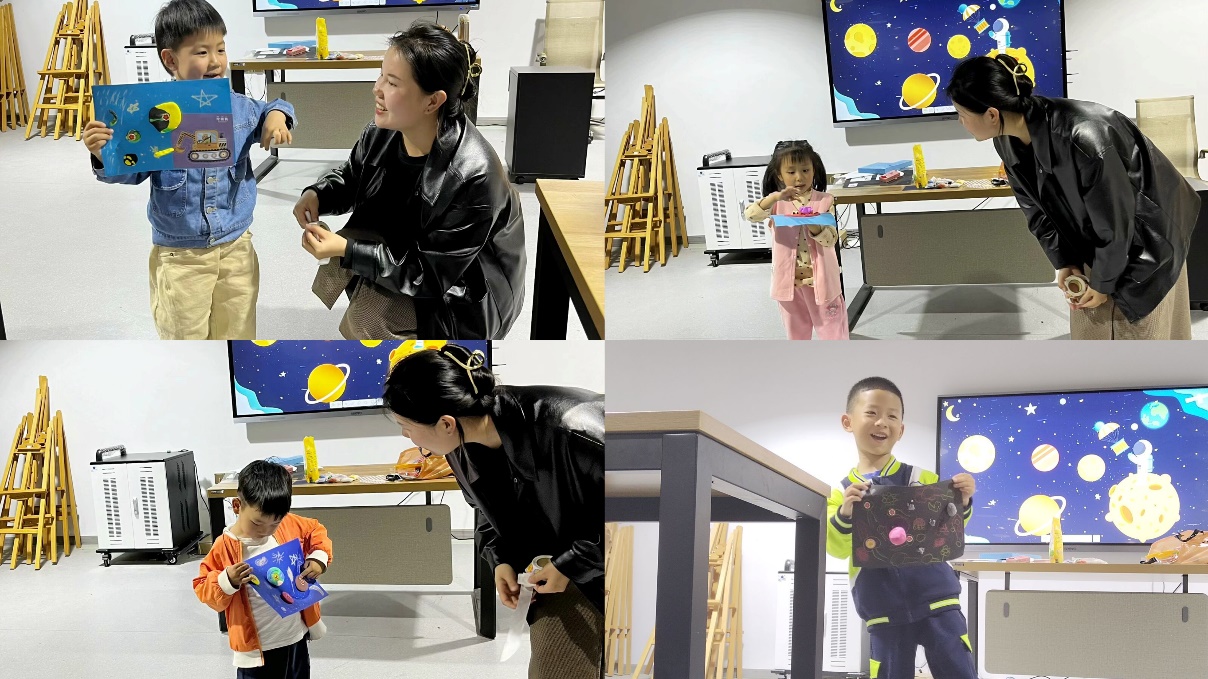 在绘画课现场,小朋友们在陈老师的鼓励下热情介绍自己的名字、年龄、兴趣、爱好,在交流中不断拉进距离。陈老师以一段有趣的星球科普动画视频,让孩子们更好了解太阳系的星球,通过视频内容和互动问答的方式,加深孩子们对星球的印象,并详细引出此次绘画创作的主题,即充分发挥自己的想象力,制作一个属于自己的星系空间。在老师详细介绍了太空星球用卡纸、油画棒和黏土的制作方法后,小朋友们开始了自己的创作之旅。在创作过程中,孩子们尽情发挥自己的想象力、创造力。在完成了以“奇妙星球”为主题的作品后,陈老师引导小朋友进行分享展示,并颁发奖励贴纸。在绘画课程结束时,有趣的教学方式深受家长和小朋友们的喜爱。